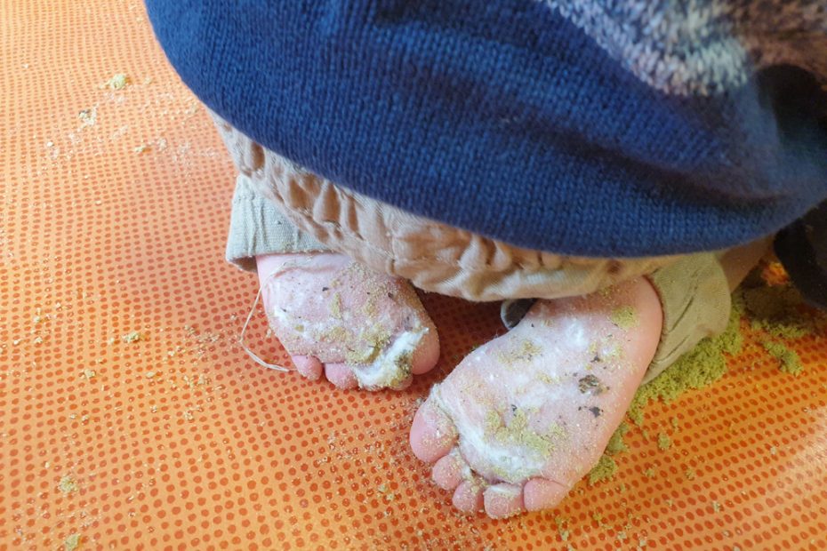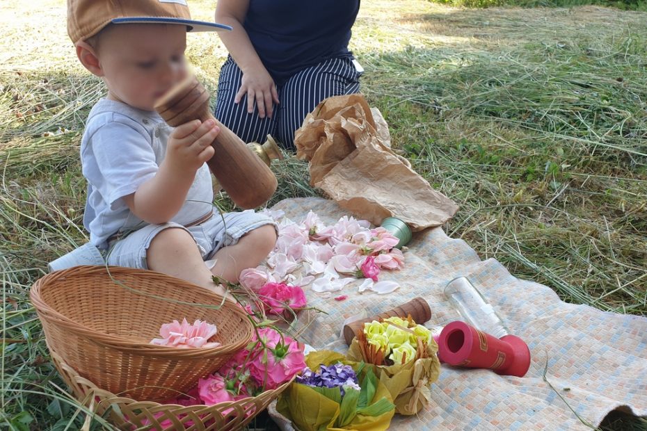 S’il fait trop humide pour sortir, alors c’est la nature qui viendra à vous! Sentier pieds nus et bac sensoriel odorant avec les enfants du Relais Petite Enfance.