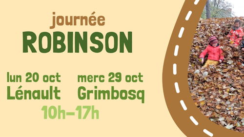 Une journée Robinson, c’est l’occasion de sortir et de se transformer en aventurier, l’espace d’une journée. Une immersion en pleine nature, pour prendre le temps, jouer, découvrir, explorer, bricoler… et se faire des copains. Pendant les vacances d’automne, deux dates sont programmées : lundi 20 octobre à Lénault et mercredi 29 octobre à Grimbosq.