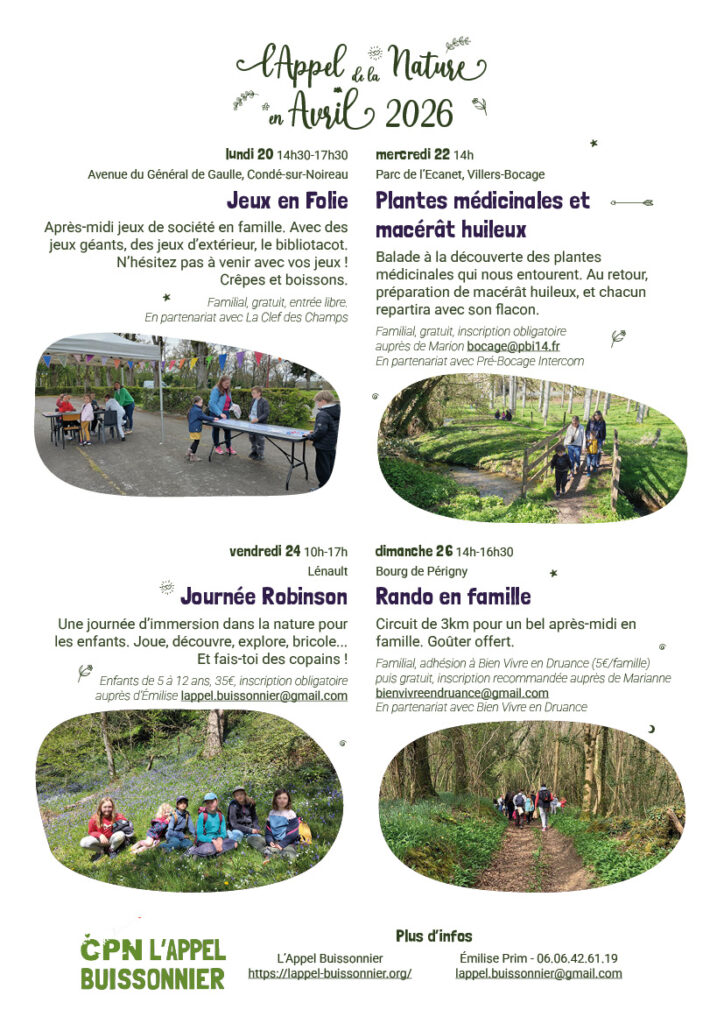 Le programme des vacances d’avril est disponible ! Quatre propositions pour tous les goûts, mais toujours des sorties en famille ! Vous pourrez me retrouver dans différents lieux naturels du Calvados : à Condé-sur-Noireau, Villers-Bocage ou encore dans la campagne du bocage à Lénault et Périgny. De quoi vous inspirer pour passer du temps en nature, avec les enfants.